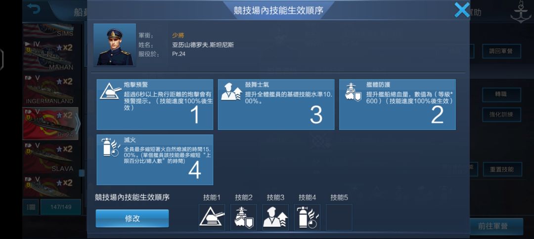 1.技能生效顺序:船员可以设置技能生效顺序,在环球竞技场中生效,环球竞技场会根据段位对船员技能数量作出限制,设置生效顺序可以在竞技场允许技能数量小于你拥有的技能数量时,按你设置的顺序优先生效排序靠前的技能。