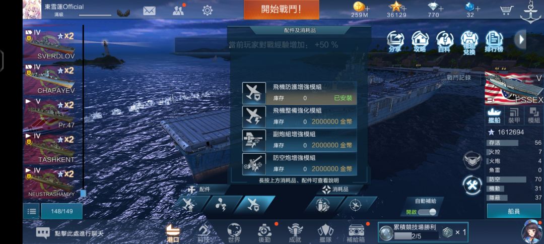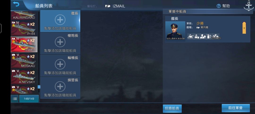 3.船员继承:推荐玩家让加点相同的所有舰船使用同一套船员。比如在爬线时,升级到下一艘舰船后,将上一艘舰船的船员换下来继续使用,这样就避免了经验的浪费,可以更快的升级解锁更多船员技能,并且一个船员只要在一艘舰船上服役过,那么他对这艘舰船的熟练度就会永久存在,下次再调回来的时候无需重新训练就可以直接继承之前的熟练度。