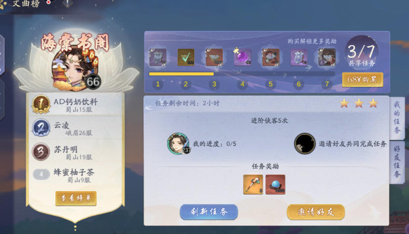 首选加入一个势力(可以免费更换一次)然后每天刷新3星任务 分享到世界和好友一起完成掉可以获得任务道具狼毫笔,然后世界留意别人分享的3星任务 一起完成了 (为了白嫖奖励必须肝一肝)各位加油![[嗒啦啦2_抱大腿]](https://img.tapimg.com/market/images/9dc10e5b23e41c7c957a1006f2db76e8.gif)