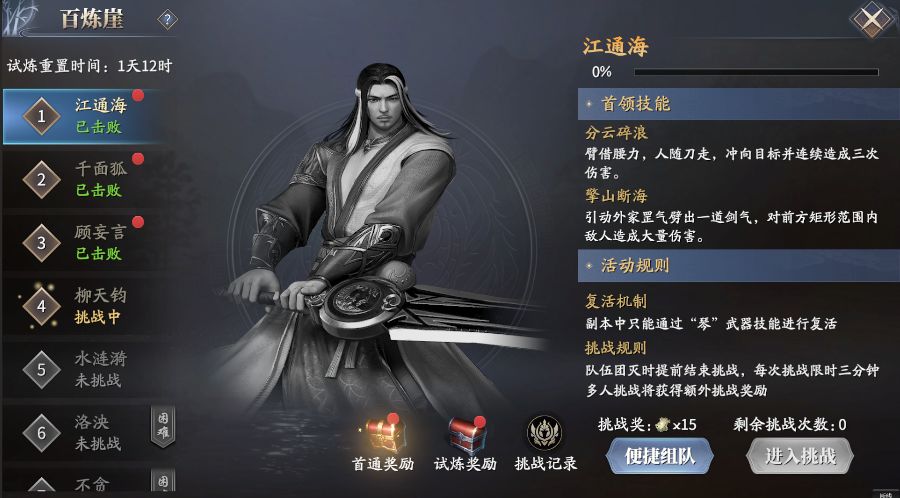 百炼崖共有8层,第1周为1~8层;之后将根据上一周的挑战结果提升副本层级难度。帮派成员可组成5人小队前往挑战,每次挑战时长为3分钟。如果中途退出将无法再次进入副本。如果3分钟内击败副本首领,那么将自动刷新下一关首领继续挑战。