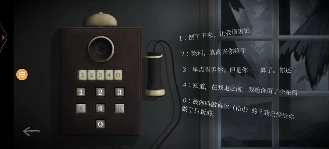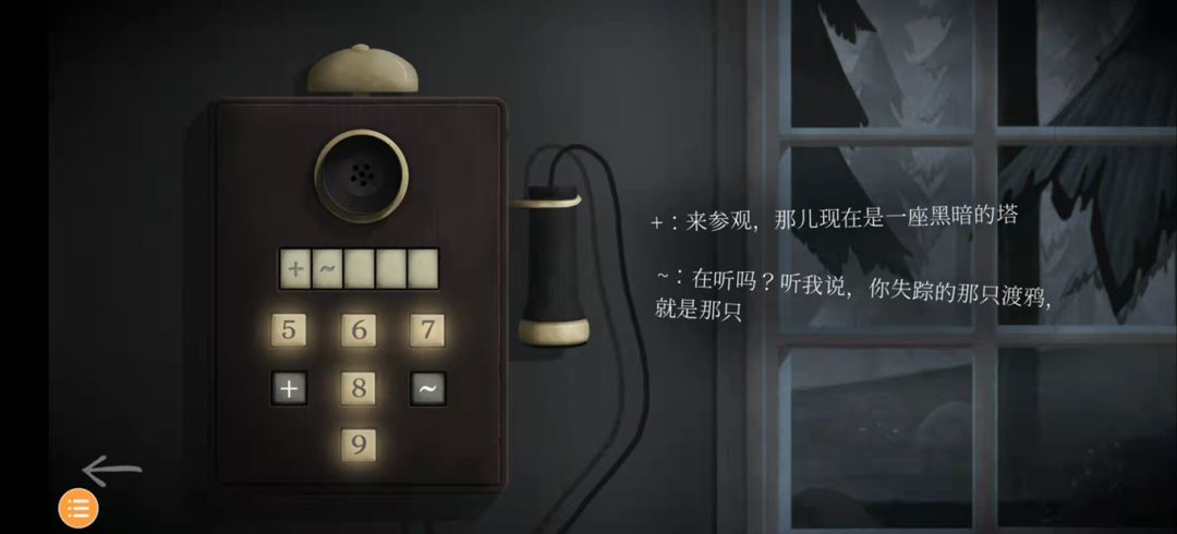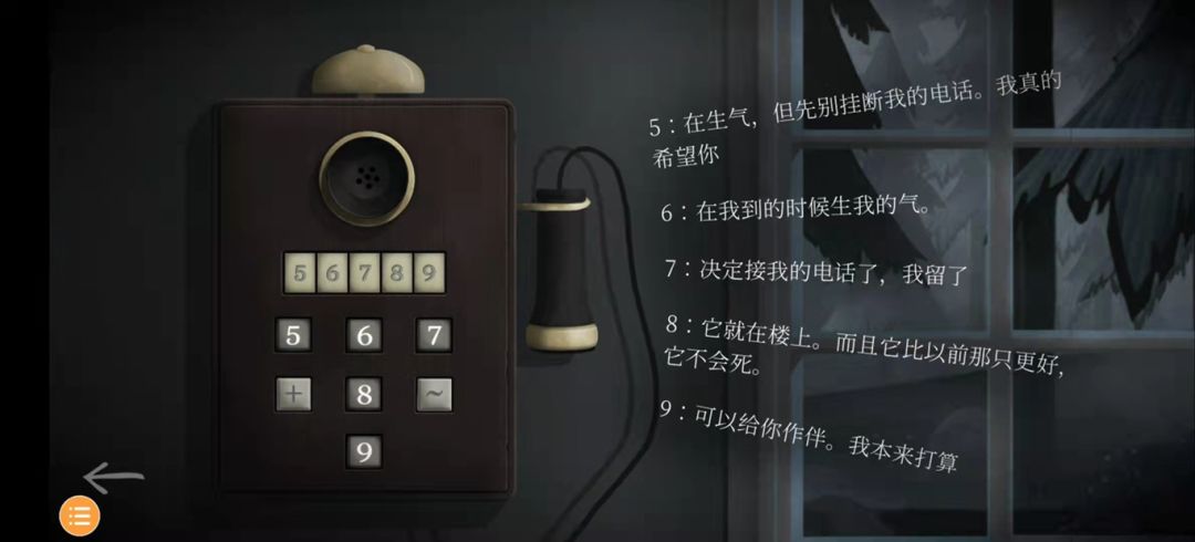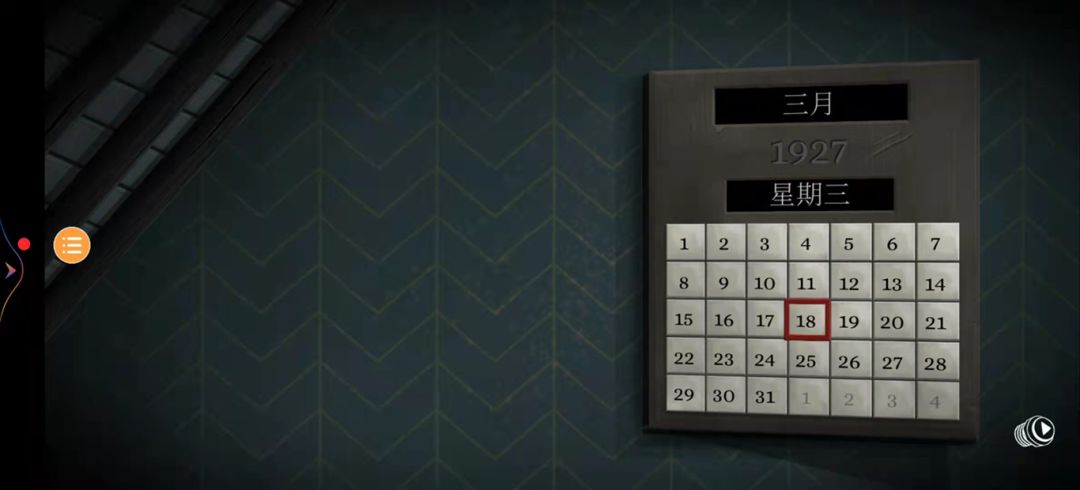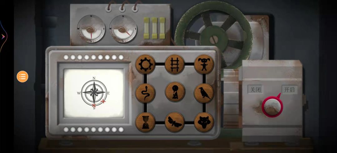 第三章时间来到1937年,第一个场景变了,所以我们不需要去看时间,注意:不要随意点击灯泡!!!来到钟表店,虽然是关灯状态,但是我们在第二章有了钥匙,可以随意进出。这次玩家一和玩家二的场景一致,进入钟表店后向下滑动,看到一台发电机,左侧的显示屏旁边有九个按键,游戏将它们从1~9依次编号,无论如何变换位置,1~9的位置是不变的,所以当它每次转动后,每次的1都不是一个按键。右侧开始后,玩家一率先有提示,之后便是玩家二有提示,一共18次,每人9次。