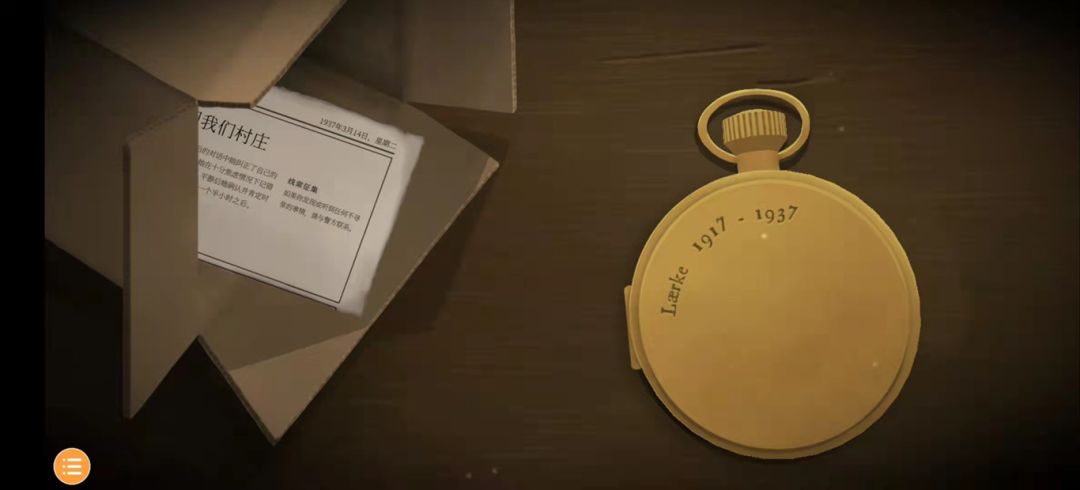 向下滑动,会出现半份报纸和一块怀表。玩家一:得知时间在十点半玩家二:得知在一个半小时后