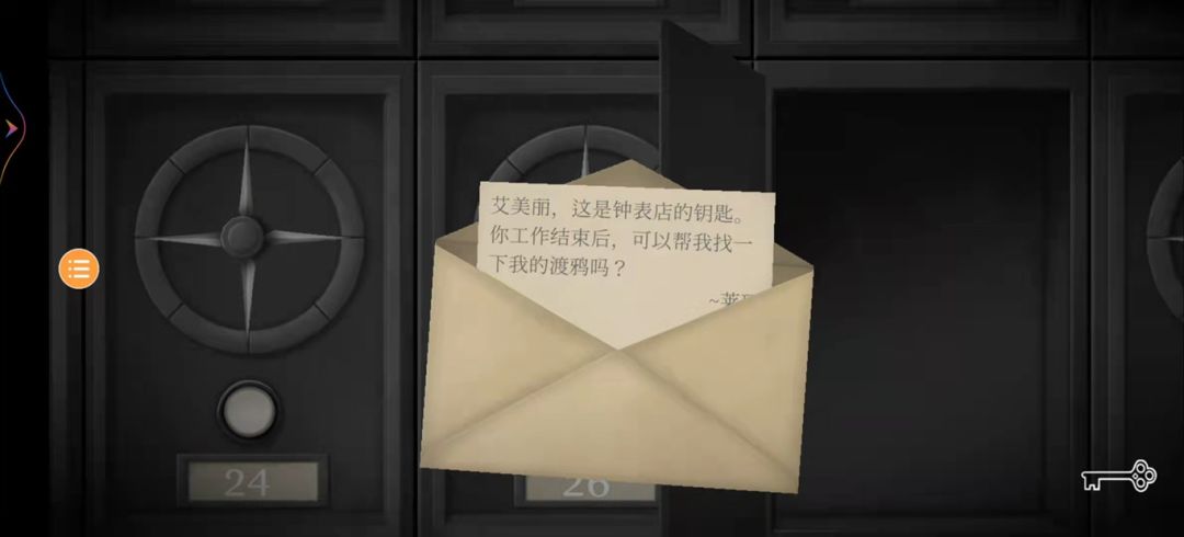 向左滑动,邮局现在是没有用的,需要我们先去雷文钟表店。按照惯例,三点开门。玩家一:得知需要在打烊之后在进入。玩家二:拿走桌子上的信和钥匙。可以看到信已经封好,贴好邮票,可以寄给玩家一。