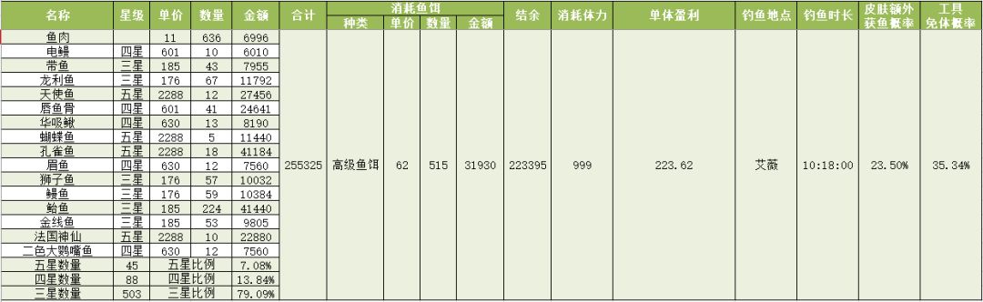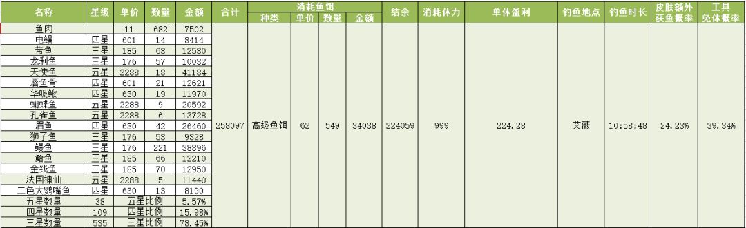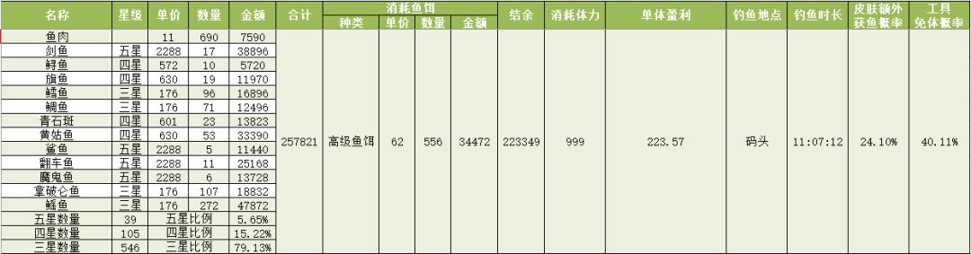 钓鱼收益测算(五级鱼杆+星星鱼竿皮肤+大鱼套+高级鱼饵(三星))