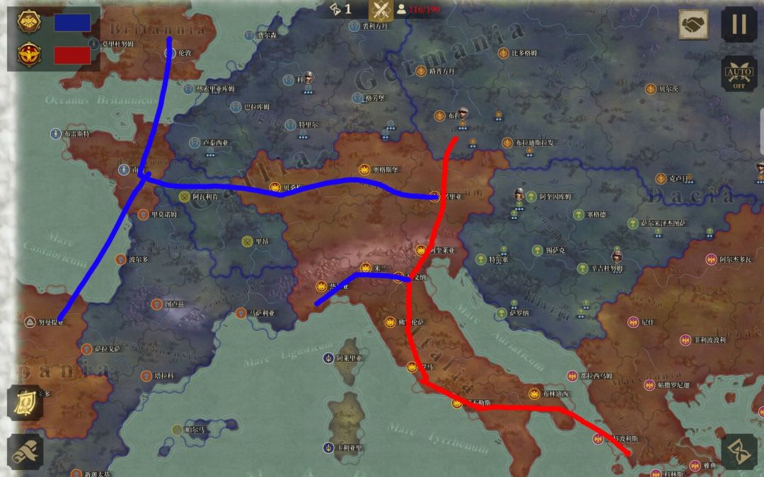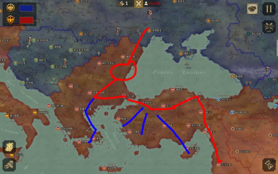 第二张图为灭东罗军,也是按如图所示走就行了,需要注意的是在红圈处迅速干掉贝利撒留和爆的几个将,疯狂给阿提拉强行军让他杀将,不然你那块地区的城是不可能守得住的,杀完后拿拜占庭,再直取小亚细亚半岛协助友军,注意不要在小亚细亚做太多停留,剩下的城用支线军队拿,要尽快与灭萨珊军汇合,此队任务较重,开局一定要把拜占庭几个将弄死。