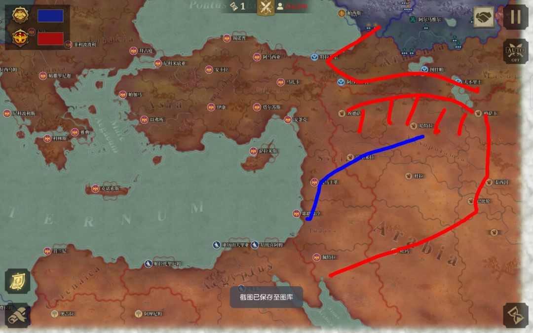 第三张图为灭萨珊军,按如图所示灭亚美尼亚后组织防御,因为萨珊爆兵很猛,在与灭东罗军汇合前很难进攻,组织防守打下的亚美尼亚城市,待与灭东罗军汇合后按如图所示路线反攻萨珊的重要大城市,最后与其他军队汇合灭埃及,此队任务很重,一定要在灭东罗军来前守住城市,不然一旦崩盘就非常难打了。