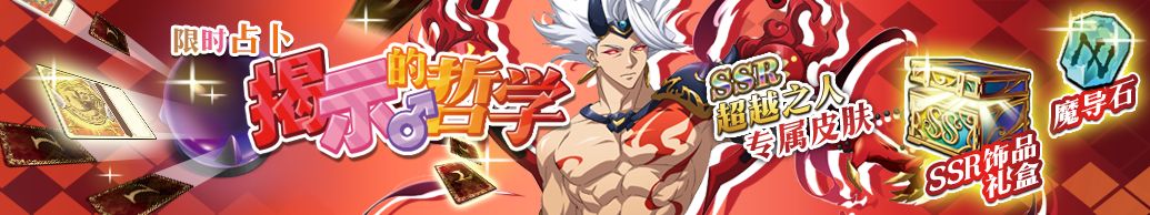 活动期间,消费一定的圣魔晶,赢取福利大奖。往期哲学皮肤限时复刻,大奖为包含SSR英雄超越之人限定皮肤「净世业火」在内的6选1皮肤礼包!