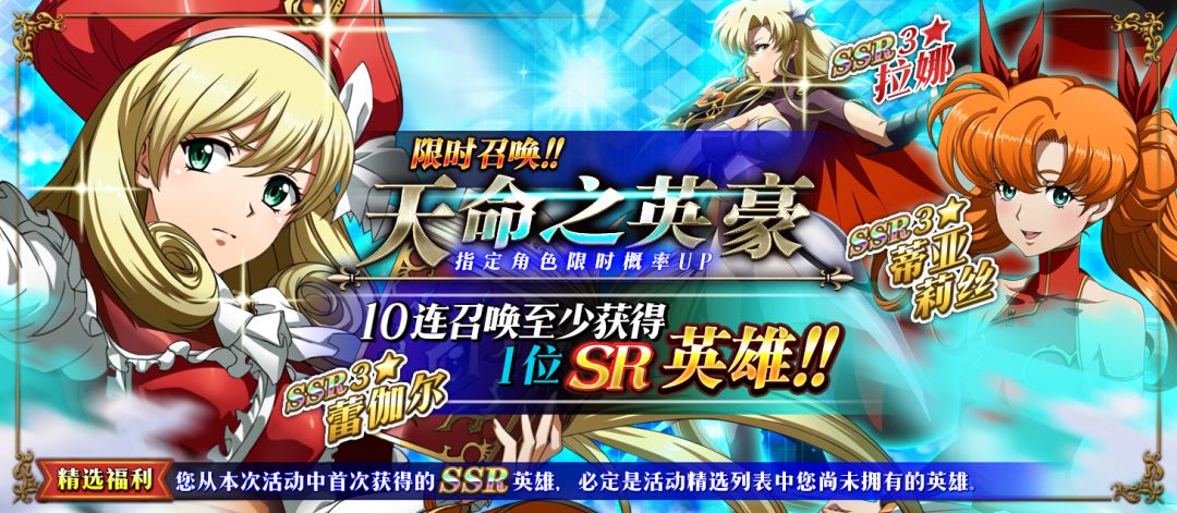 限时召唤「天命之英豪」中SSR级英雄拉娜、蒂亚莉丝、蕾伽尔出现概率提升!