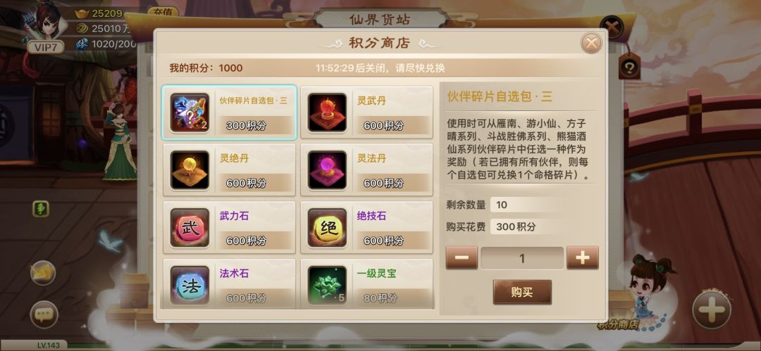 4.积分可在积分商店中兑换伙伴碎片自选包三、伙伴灵丹、主角属性石、下级宝具残片等奖品