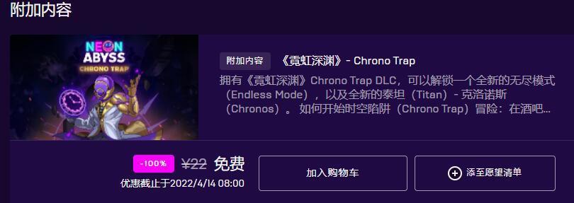 肉鸽动作游戏《霓虹深渊》Chrono Trap DLC现可免费领取。可以解锁一个全新的无尽模式,以及全新的泰坦-克洛诺斯。