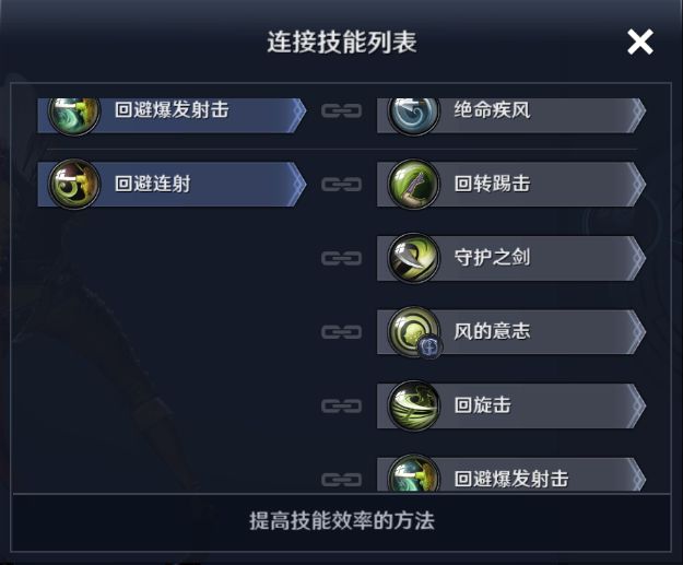 关于技能连招什么的,PK技能列表里的技能,对应连接技能列表里,那些技能一起使用可以增加效率,也就是流畅顺滑度,这个大家可以多去练习