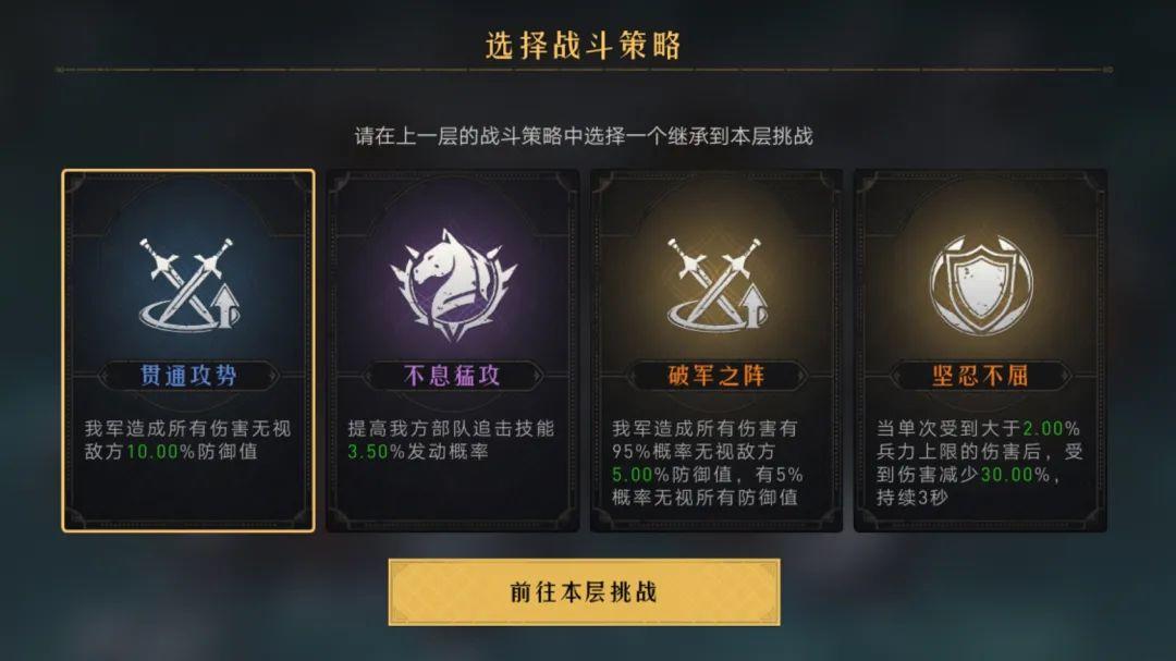 直接选取一个高级战斗策略,用以强化军演部队,并且在通关开启下一层挑战时,可继续选择一个上一层用过的策略。