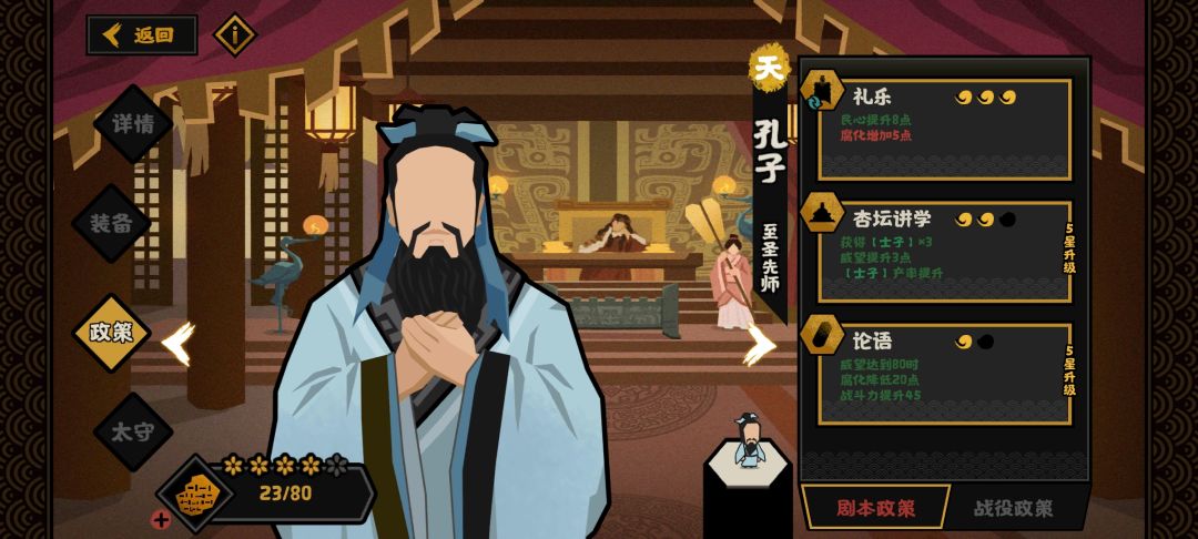 孔子做城主就可以轻松拿到每个产业+5威望,及二技能的几点威望,在点几个事件很容易上80,更不用说跟其他加威望的配合会更快