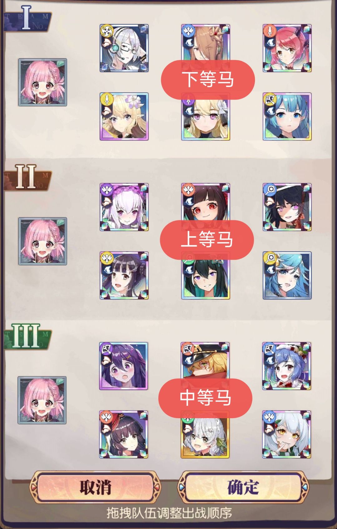 巅峰天梯由于提前一小时锁阵,因此,三分靠实力,七分靠运气,一般来说大天梯的出战顺序为:下等马,上等马,中等马,如下图: