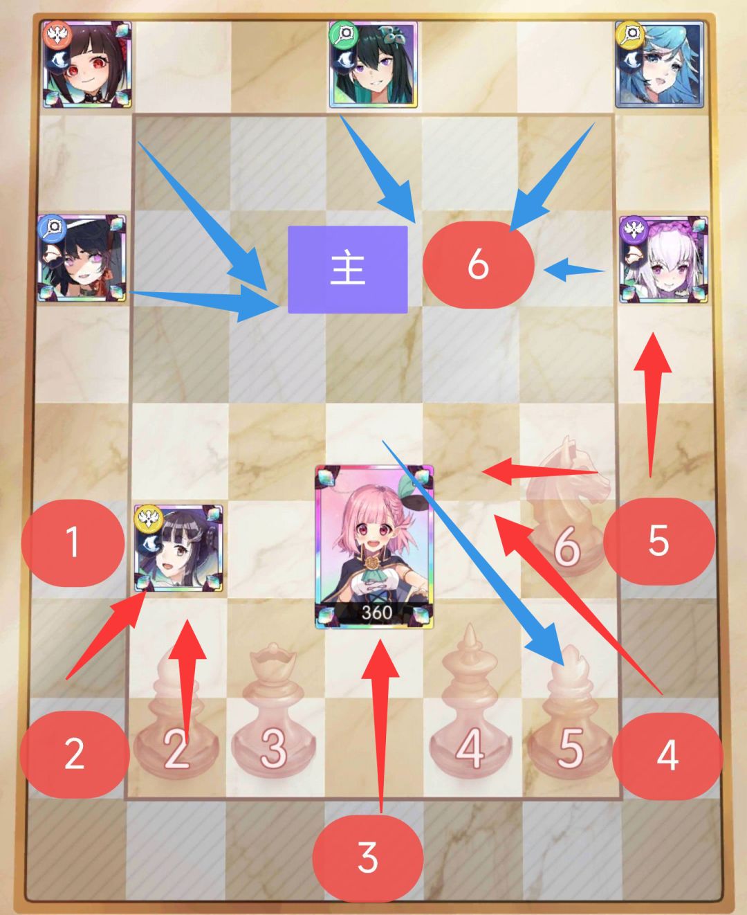 这是最常见的初始攻击图,很明显,主角旁边的英雄唯一的任务就是尽量拖住,活的更久点,比如云翘的闪,圣希的冰箱等,而爆发类英雄的攻击范围尽量覆盖到对面的主角和6号位英雄,即下图: