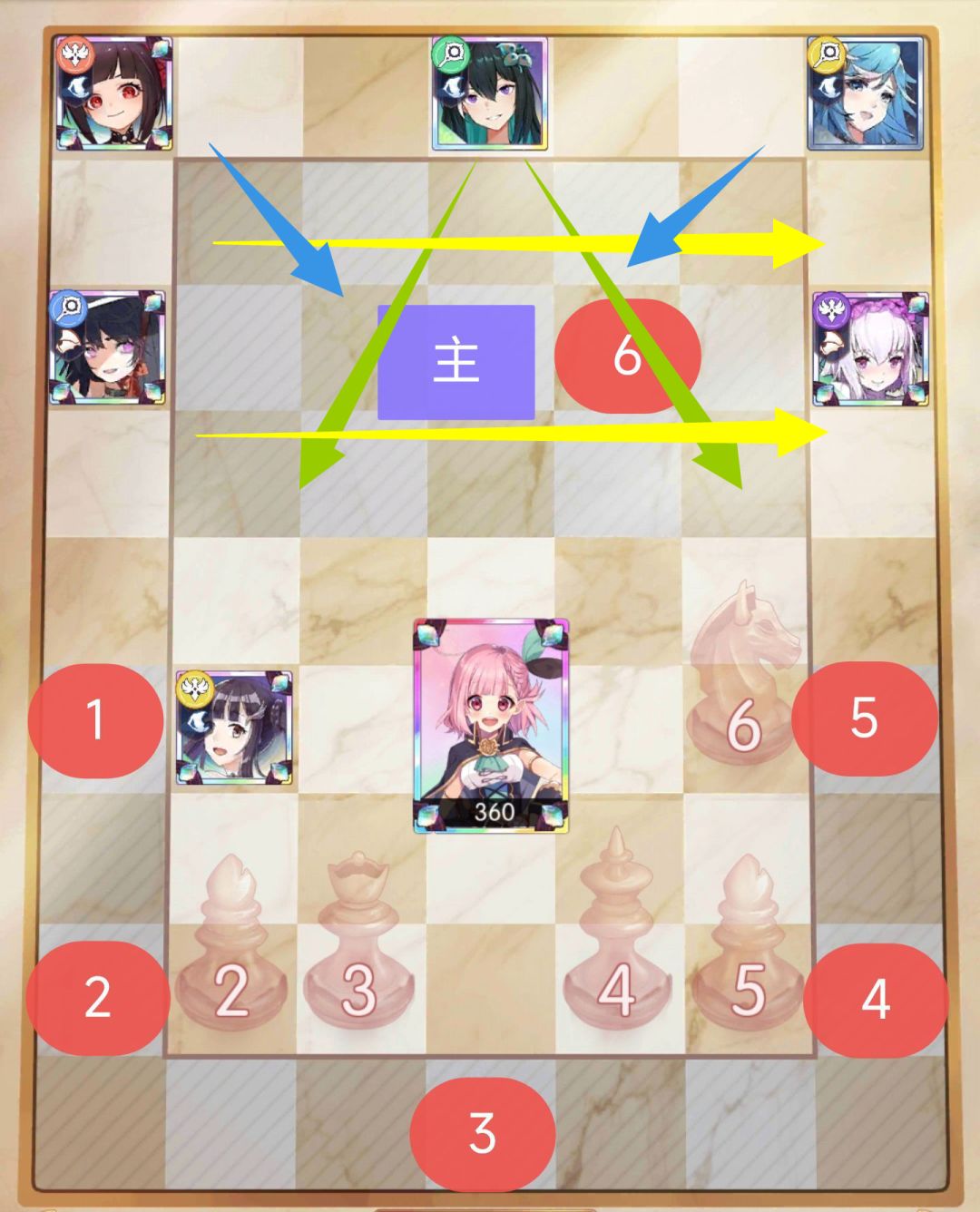 小天梯攻击阵容,一般作为主攻方是可以调整进攻队伍顺序的,比如强打中,中打弱(俗称赛马),不仅可以赛马,而且还能调整队伍站位,因为进攻方除非在品质和卷轴都被碾压的情况下,一般都可以赛赢,如下图(对不起了轮回帝),黄色为我方进攻方向: