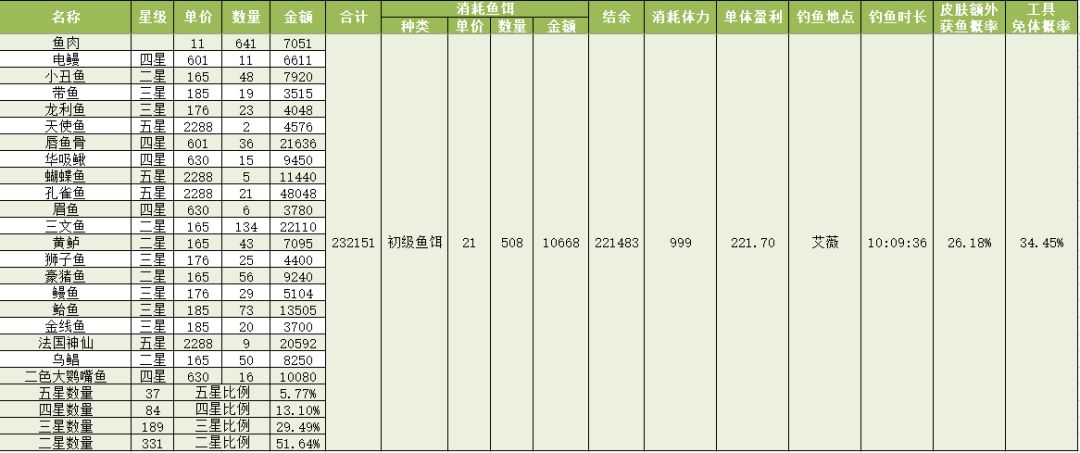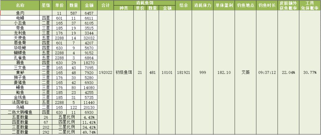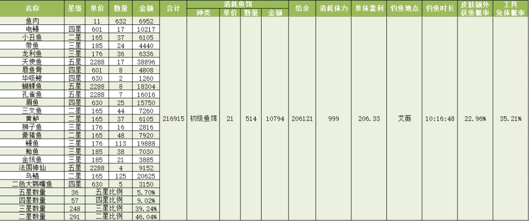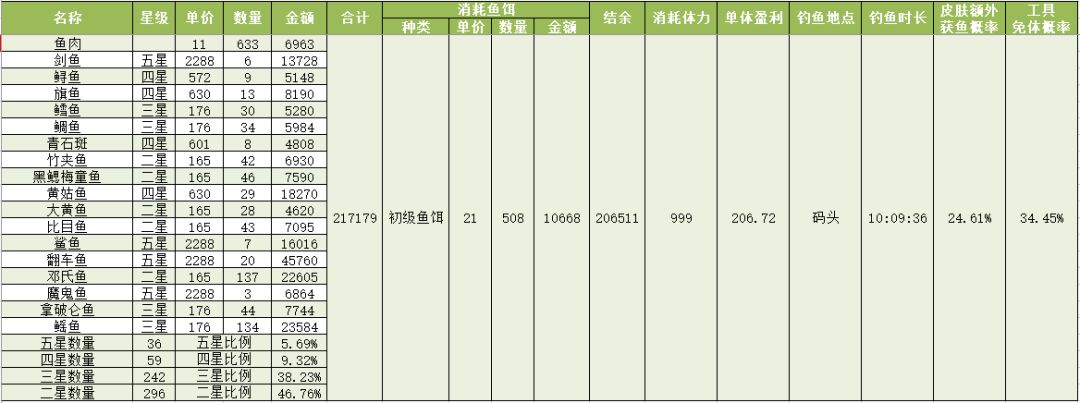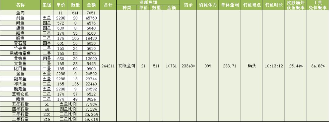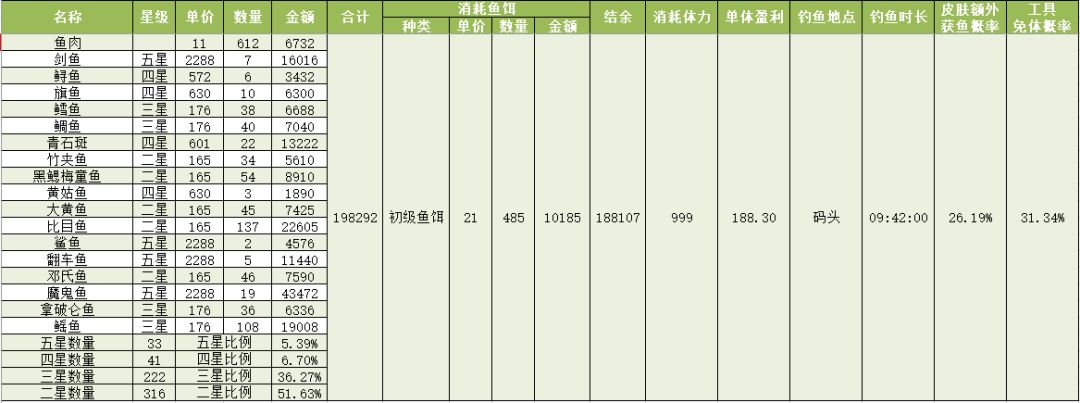 钓鱼收益测算(五级鱼杆+星星鱼竿皮肤+大鱼套+初级鱼饵(一星))
