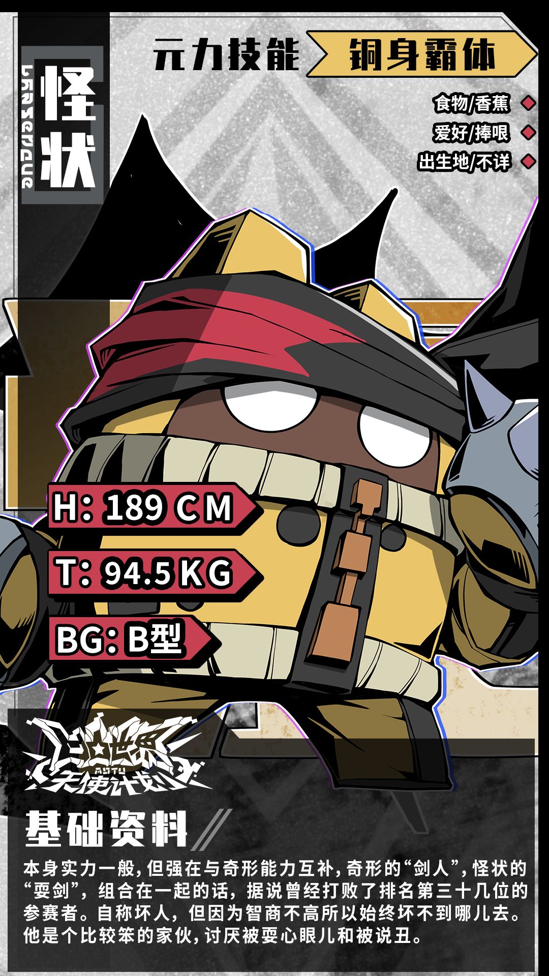 怪状,本身实力一般,但强在与奇形能力互补,奇形的“剑人”,怪状的“耍剑”,组合在一起的话,据说曾经打败了排名第三十几位的参赛者。自称坏人,但因为智商不高所以始终坏不到哪儿去。他是个比较笨的家伙,讨厌被耍心眼儿和被说丑。