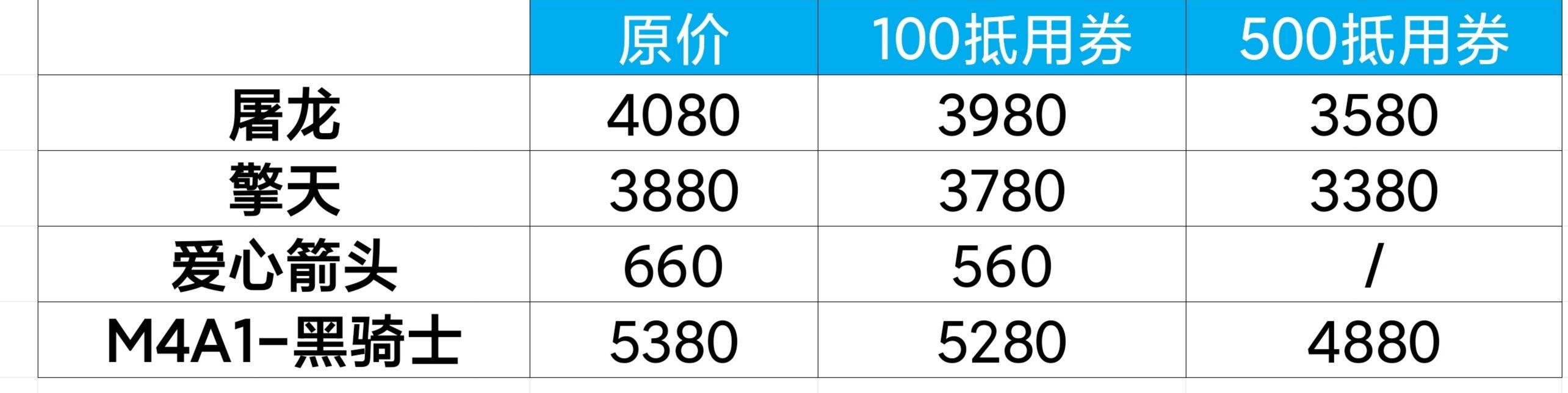 除了上述武器道具之外,同时还有一些小编认为其它相对比较值的东西就还有屠龙、擎天、M4A1-黑骑士、以及爱心箭头了。这里面除爱心箭头之外截止时间都未标明,爱心箭头玩弓的小伙伴可不要错过。价格就不为大家过多赘述了,下表为大家提供参考。