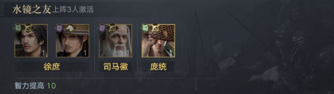 3、水镜之友:和司马徽、庞统一同上场激活,效果为:智力提高10点