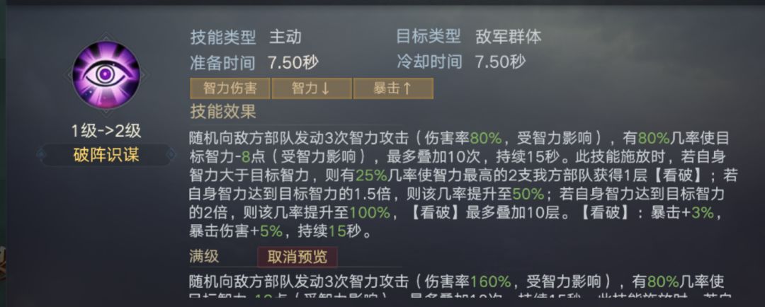 满级:随机向敌方部队发动3次智力攻击(伤害率160%,受智力影响),有80%几率使目标智力-12点(受智力影响),最多叠加10次,持续15秒。此技能施放时,若自身智力大于目标智力,则有25%几率使智力最高的2支我方部队获得1层【看破】;若自身智力达到目标智力的1.5倍,则该几率提升至50%;若自身智力达到目标智力的2倍,则该几率提升至100%,【看破】最多叠加10层。【看破】:暴击+3%暴击伤害+5%,持续15秒。