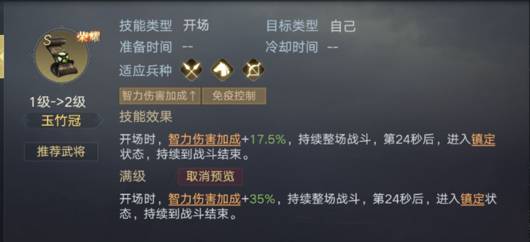 1、开场为自己增加35%的智力伤害,持续整场战斗,适合于法师型武将,例如:周瑜等