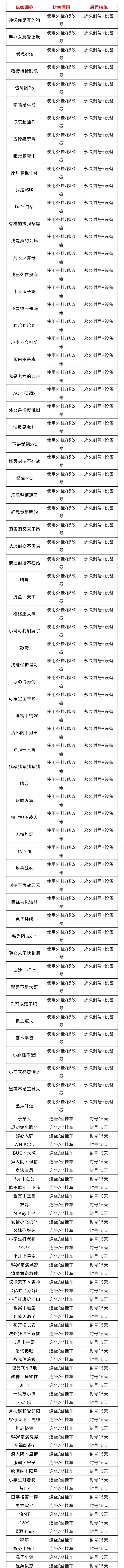 《王牌战争:文明重启》官方一直致力于维护游戏公平性和保证良好的绿色的游戏体验。针对使用外挂、连点器、第三方软件等行为,研发团队已经在第一时间优化了监控系统,确保作弊行为在被发现后及时锁定相关账号。在锁定作弊玩家后,我们将会给予对应的惩罚。如发现此类作弊、违规的玩家,我们会对其进行封号、封设备等措施。文妹想让更多的玩家感到安心,为此我们决定每周五公布外挂封号名单。让我们的净化行动“透明化”。文妹也希望各位能坚持正确的游戏态度,与我们共同守护游戏环境,抵制所有外挂、作弊、第三方软件。也欢迎使用举报系统、专区留言等方式向我们反馈。净化游戏环境,我们一直在努力!本周共处罚账号9978个,其中封禁开挂账号7616个,坐挂车/连坐账号103个。以下是4月2日-4月8日部分严重违规玩家名单,玩家均已受到惩罚。