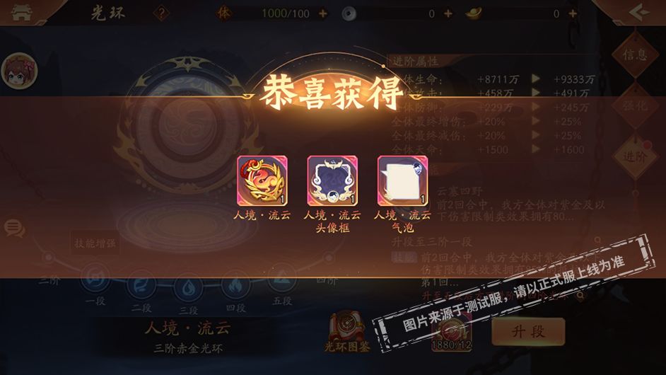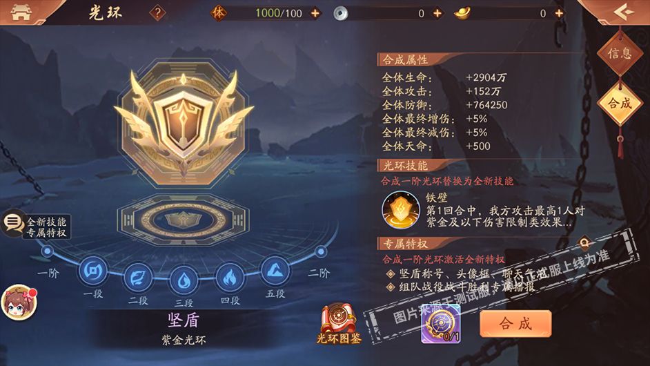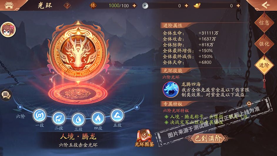 首批光环的品质从高到低一共分为六阶,其中每一阶需要升满五段即可提升至下一阶。每次提升,光环的属性和技能都将更上一层楼!