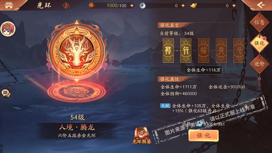 除了升阶和升段外,光环还可以通过消耗指定材料进行强化。提升强化等级后则会解锁不同的属性,而达到一定等级时还可以激活相应的天赋!