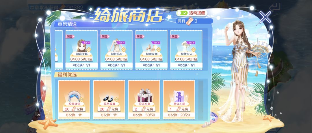 游轮之旅第三站·海景美味相伴1.【绮旅商店】送4周年限定粉臻组合装/臻品时装/花语礼盒/手持/极光抽奖券/全景名片夹(背景)/头饰/鞋子/动作卡2.【海景相伴美味】送头饰/旅行币3.【甲板纷飞纸鸢】送兑换道具-旅行币4.【浪漫游轮启程】送趣味称号/聊天气泡5.【周年庆瓜分十万现金】现金红包/Q币/实物周年/美衣/名片通通可兑换