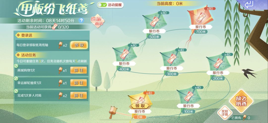 截止至4月17日,来参与限时活动【甲板纷飞纸鸢】通过完成任务、每日登录获得纸鸢线轴,每消耗一个纸鸢线轴均可让纸鸢上升20米,还能获取更多旅行币哦~