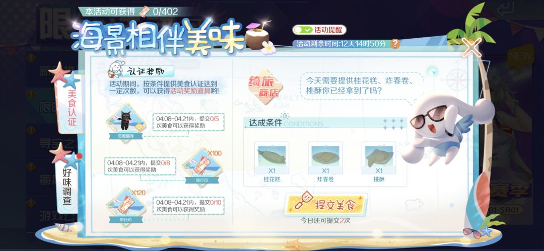 4月8日-4月21日期间,来参与限时活动【海景相伴美味】通过每日任务、给好友赠送美食随机获得完成美食认证所需的缤纷美食,累计完成美食认证一定次数就能获取猫咪恶魔头饰&海量旅行币哦~