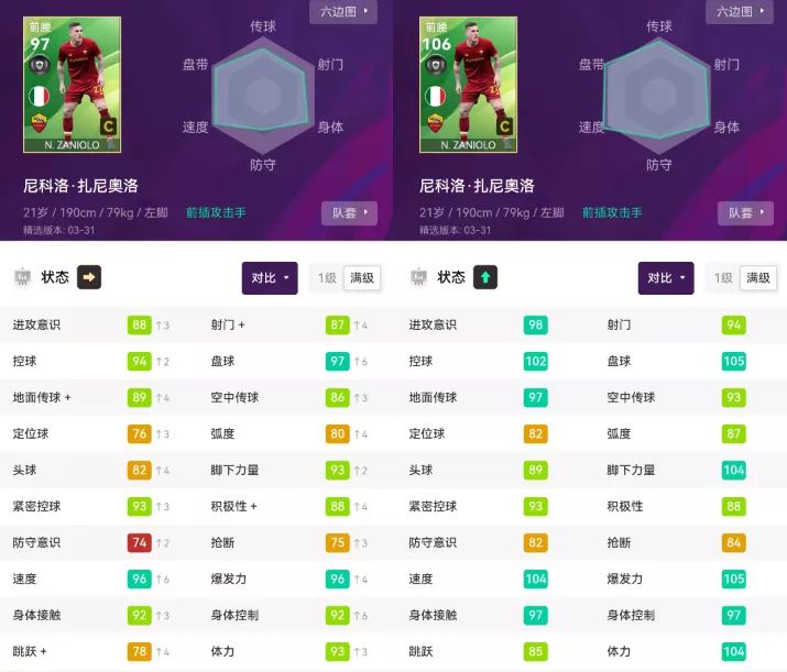 其他方面,体能和前插跑动积极性 扎尼奥洛都强不少,也就在攻击意识和传球上稍微差了点!但总体 扎尼奥洛这卡还是非常强悍的,可以说达到了毕业级别。 下月的天梯胜率只有这卡拥有的人比较多,挑战第一前腰胜率是完全可能的!