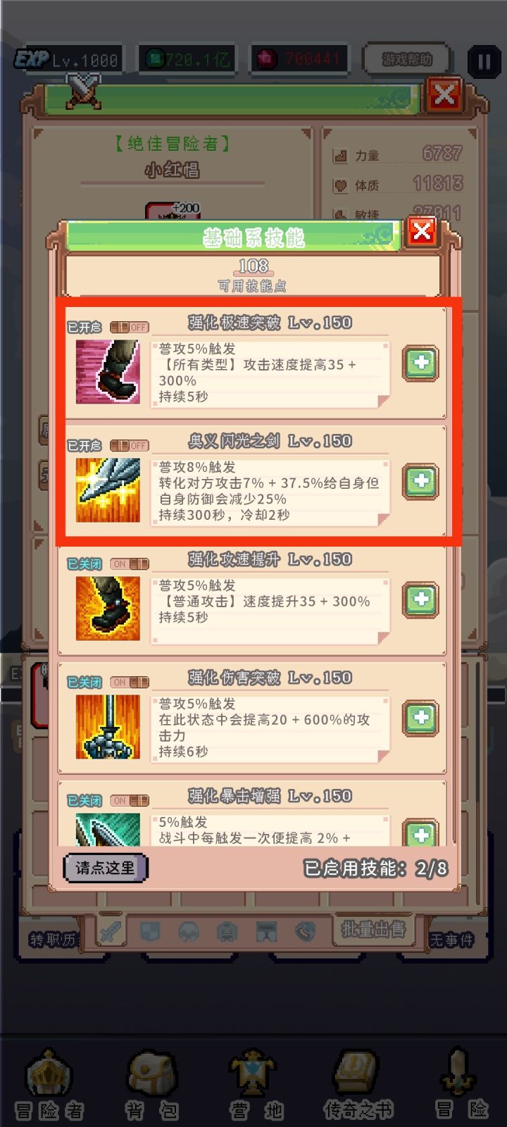 补充:测试发现,开启的技能越少,触发技能的几率会越高,也就是说,只需要开启极限突破和闪光之剑就够了!
