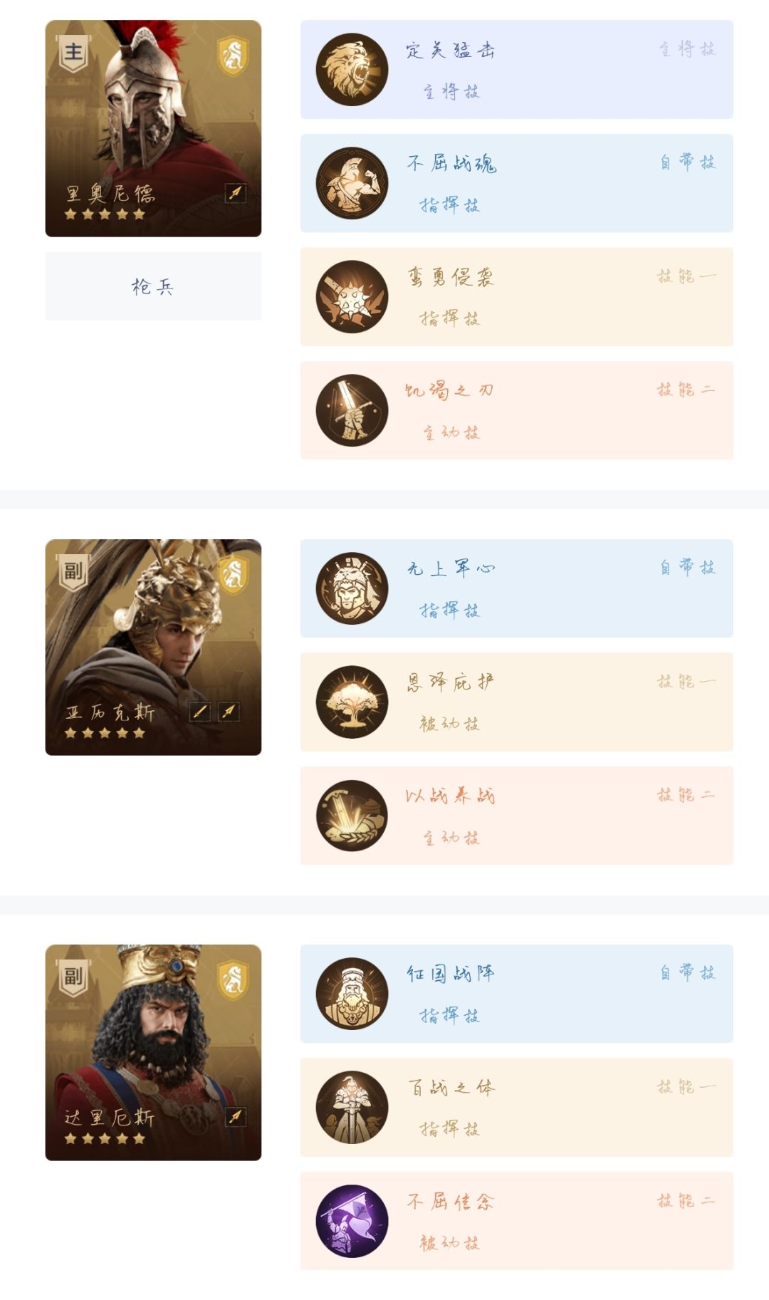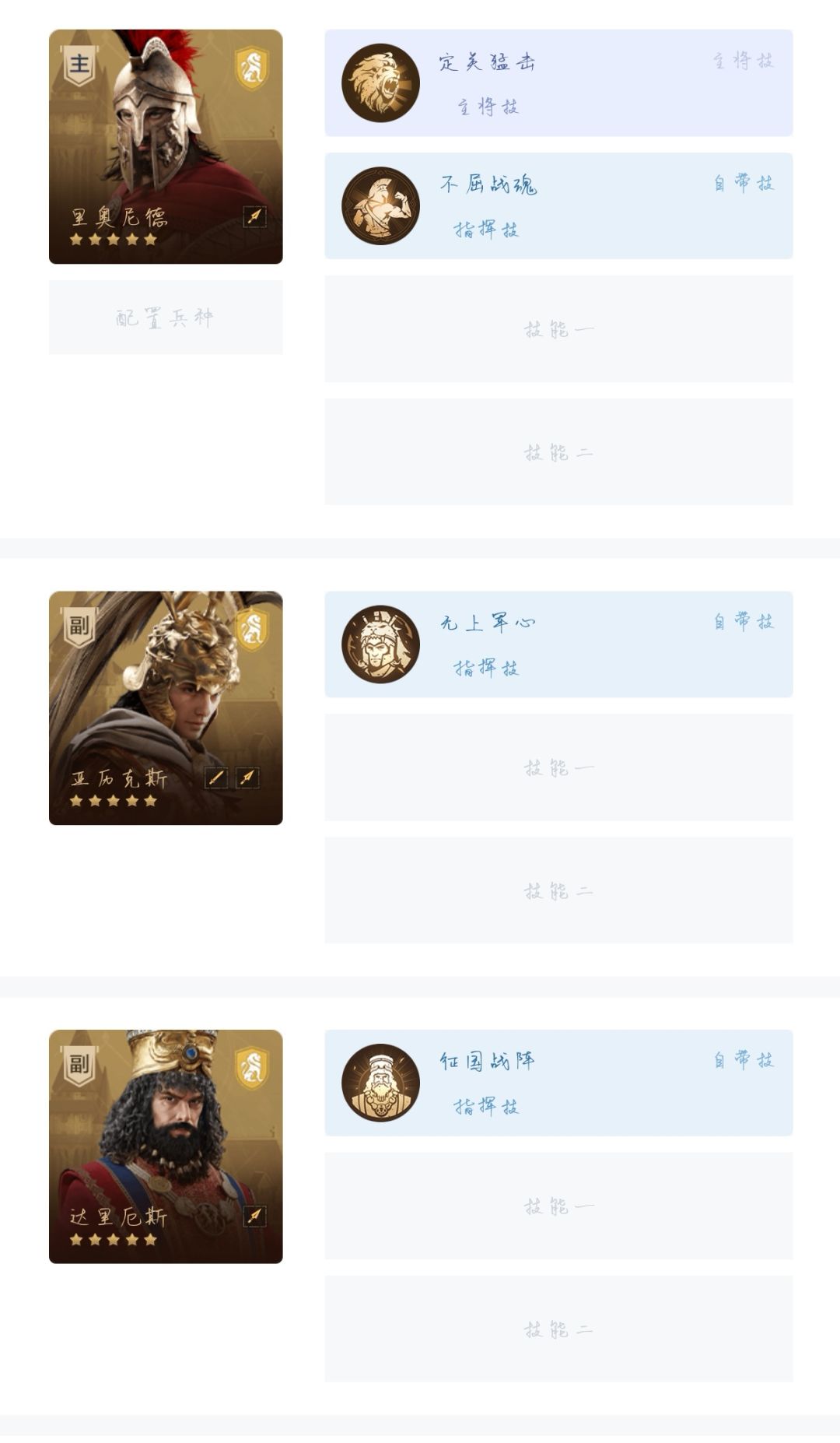 主将我们的选择是里奥尼德为了基本的伤害,副将我们选择亚历克斯和达理厄斯(其加点主要是谋略,技能回复有着谋略和武力的双加成),副将我们选择是一个谋略一个守备将领。