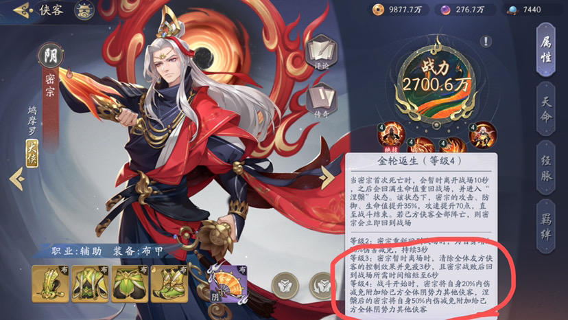 ;然后是阴系的密宗,其实练五阴的玩家这张卡是必练的,功能性非常强,输出也不弱,这里我只说下非五阴玩家的选择,如果你轮椅练度足够(开了天命),那么可以天下、轮椅、密宗三人一队,密宗红1就可以上场,激活三阴属性,