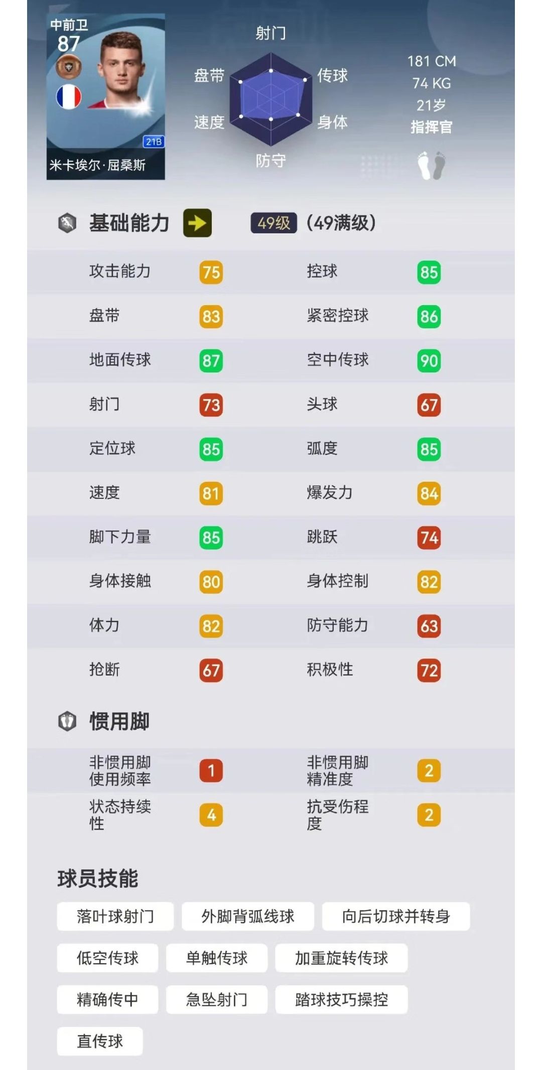 这张屈桑斯没有太过出众的数据,他的优势项在于传球,87的地面传球+90的空中传球,配合相应的技能,使得他传的很准,游戏中的手感也还不错;他的控球和盘带数据一般,在游戏里面实际手感要比数据给的更差一些。