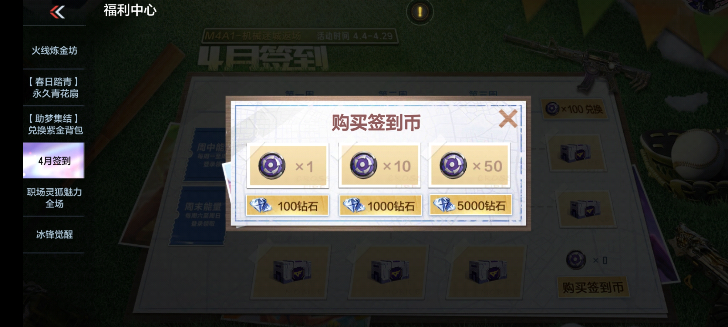 如果不想每周辛苦签到,钞能力的玩家可以直接购买签到币,100个签到币即可兑换M 4 A 1-机械迷城,一个签到币是100钻石,签到币有1、10、50的选项,也是方便大家能够快速购买这个签到币。