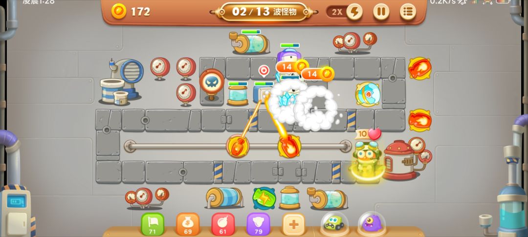 看这里,开局两个火瓶放右边,瞄准宝箱烧,不用管第一波怪,让怪多走一会儿,下面放一个满级瓶子收割。