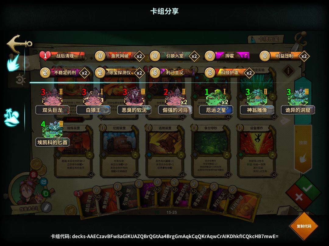 建议大家试试无限盾制流炼金,机制是通过护罩与引狼入室,鱼死网破,寻宝探测仪的结合,形成一个全体减盾自身加盾的良性局面,并且通过利益压制,保障自己手里不会缺少科技护罩这张核心卡。这套卡组主要针对的对象是杀人流,比如说针对猫猫的怒火中烧,炼金的战场清理,剑童的寒冰诀,乌鸡的去魔语减甲。在面对减甲猎真伤炼金都有很好的战力,但是对于三产钱的话(特别是有两个地下五一的时候),这套卡组就比较难玩了,只能通过科技护罩+引狼入室压低血线,然后不稳定药剂打真伤,但是一般是打不死人的(我试过了,一滴血都让两个五一抬到五滴血)。