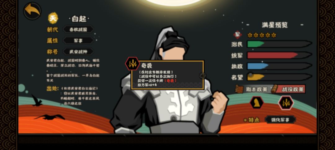 在我心中,军事第一意味着要拥有强力的战斗技能,以及加军心战力军队规模等。战役中,也需要有突出的军事面板,以及强力的技能。