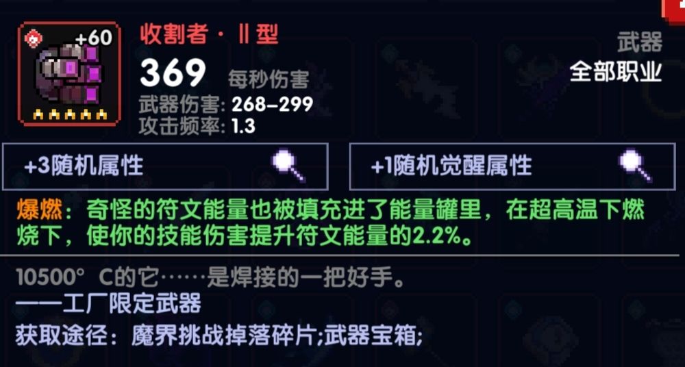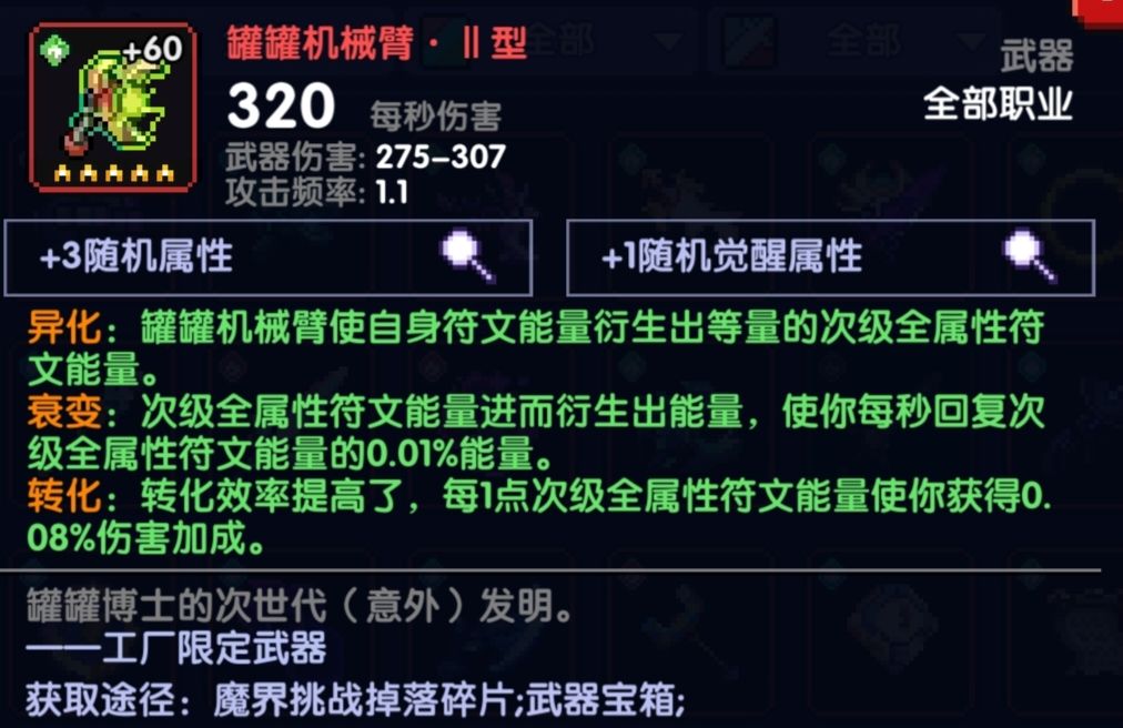 首先是机械臂,异化效果可以让你获得等量的次级符文能量,这个次级符文能量对收割者(加技伤的那把武器)也很重要,提供双倍技伤,可以说是收割者需要绑定机械臂使用