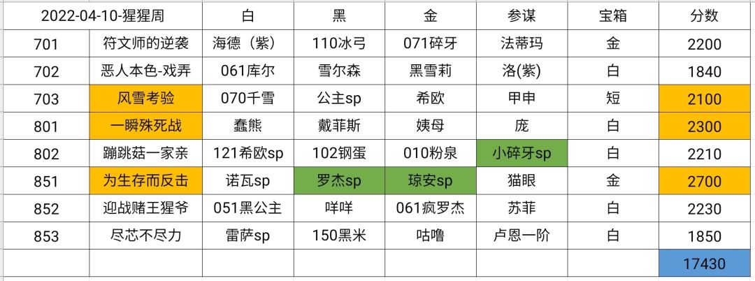 853主要靠联动,雷萨没加值,金位本来用姨母联动的,但是生存制没姨母又不太好肝(其实就是缺角色练度),后来发现可以用咕噜,开局打死一个触发咕噜被动加盾,雷萨白3联动金黑1,咕噜有盾的时候给强化,黑米输出,5T