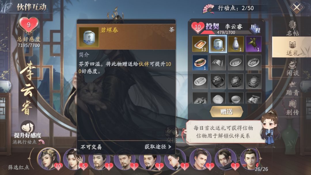 为了接近长公主,我们可以投其所好,向她赠送礼物,碧螺春,罗浮春可都是佳品,能增加不少好感度,赠送普通的紫色和蓝色道具,也可以积累好感度。