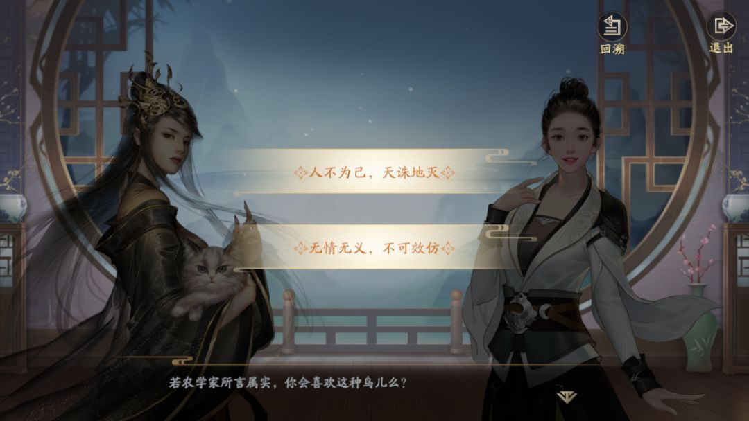 默契度可通过完成攻略提升,点击“攻略”会进入剧情场景对话,选择正确的回复,便能够提升默契度;比如说在“笼中之鸟”这段对话中,长公主与我们聊到了子规,这种鸟会把蛋下到其他鸟的巢穴中,接着话锋一转问我们对这种鸟怎么看,表面是在问鸟,实际上是在问人。所谓“伴君如伴虎”,这答错一句,那可就有性命之忧,所以这个时候应该照着长公主的意思,回答“人不为己,天诛地灭”,方能讨得其欢心。