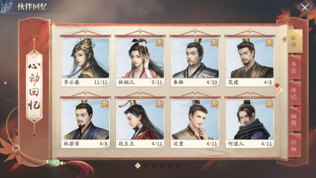 点击界面中的“交往”,选择长公主,便可以看见四个挂轴,以及一面扇子,分别是“互动”、“交往”、“同游”、“回忆”、“余年雅集”。