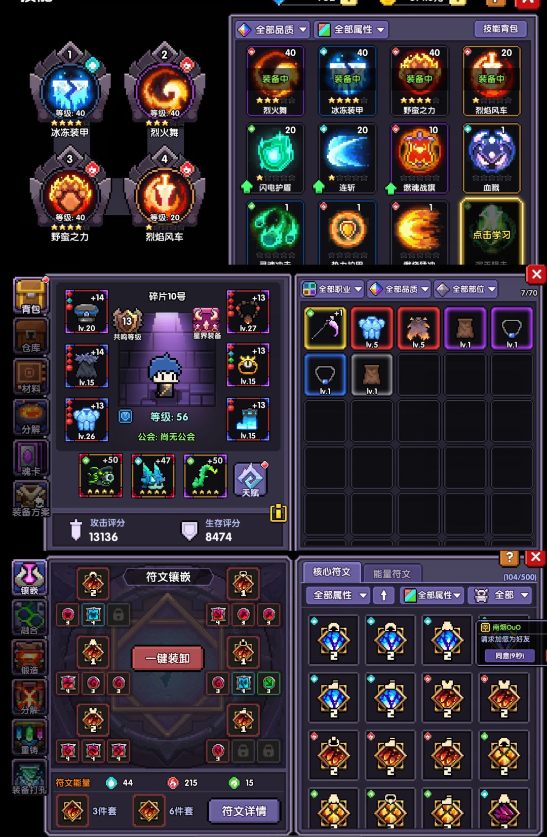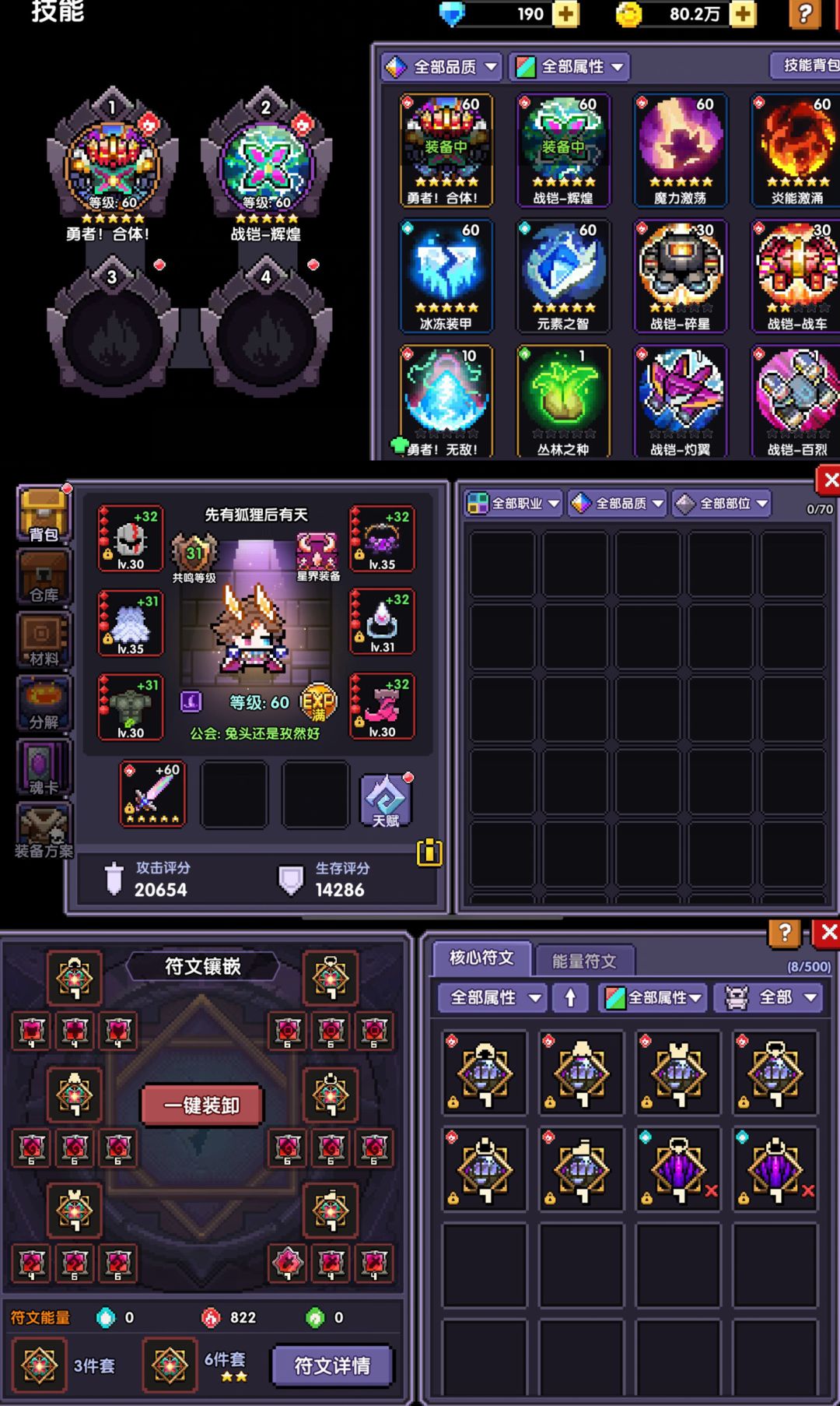 85层后攒的武器币技能币全部砸进命运系列-【勇者锋芒】,再到商店或者技能书卷里抽【勇者合体】和【辉煌】,符文换成智慧核心套,好处是全职业通用,可以快速完成导师任务。