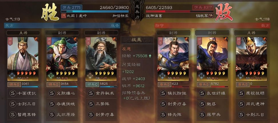 程昱三势阵组合: (主将)程昱,战法搭配:士别三日+暂避其锋 (副将)姜维,战法搭配:夺魂挟魄+火炽原燎 (副将)左慈,战法搭配:三势阵+刮骨疗毒 接下来是PVP实战对抗图: 首战打的是太尉盾,最终5000战损就打穿了对手,拥有来自程昱禁疗和姜维火炽原燎点火的双克制,目前低红太尉盾还是以带藤甲的居多!
