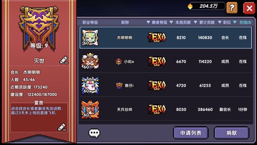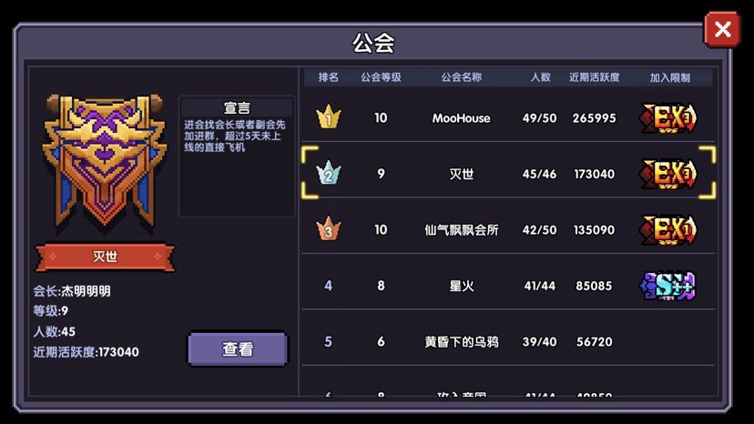灭世公会招人:收活跃的,实力强不强无所谓,最重要的是活跃呀!还有就是能坚持下去的小伙伴,一起提升实力,不再孤单