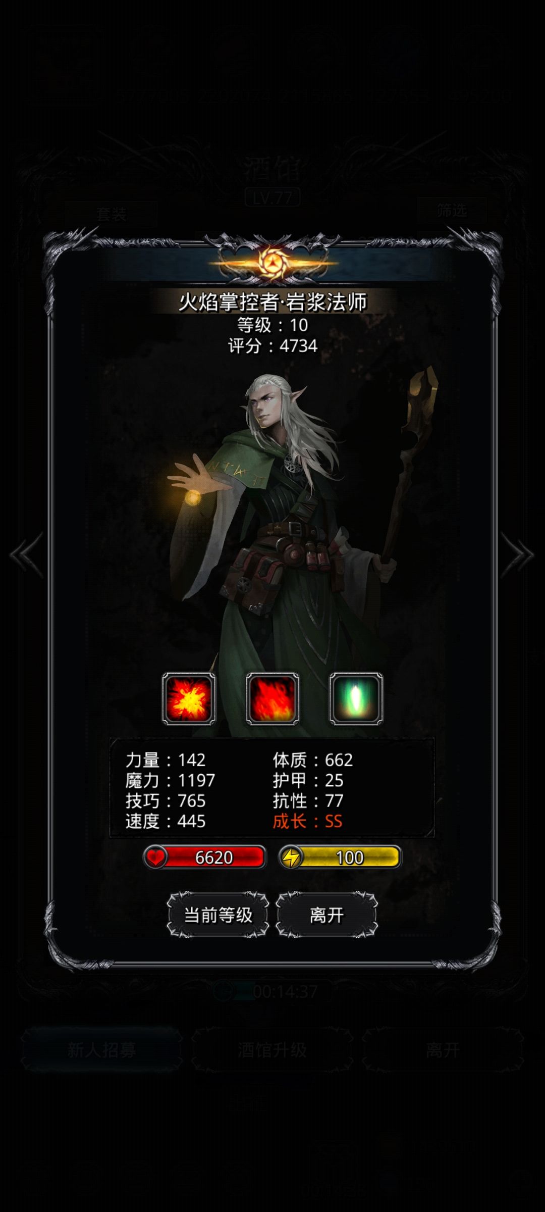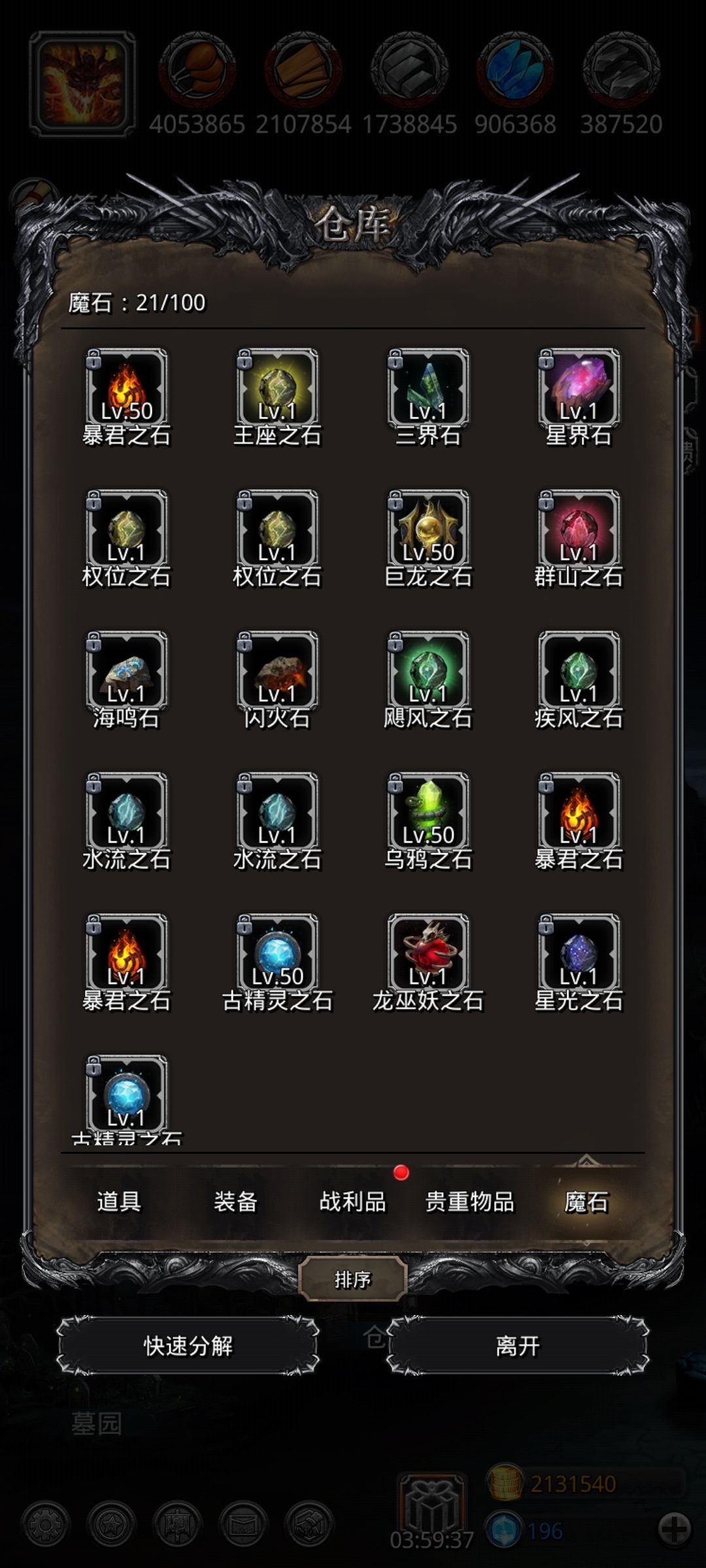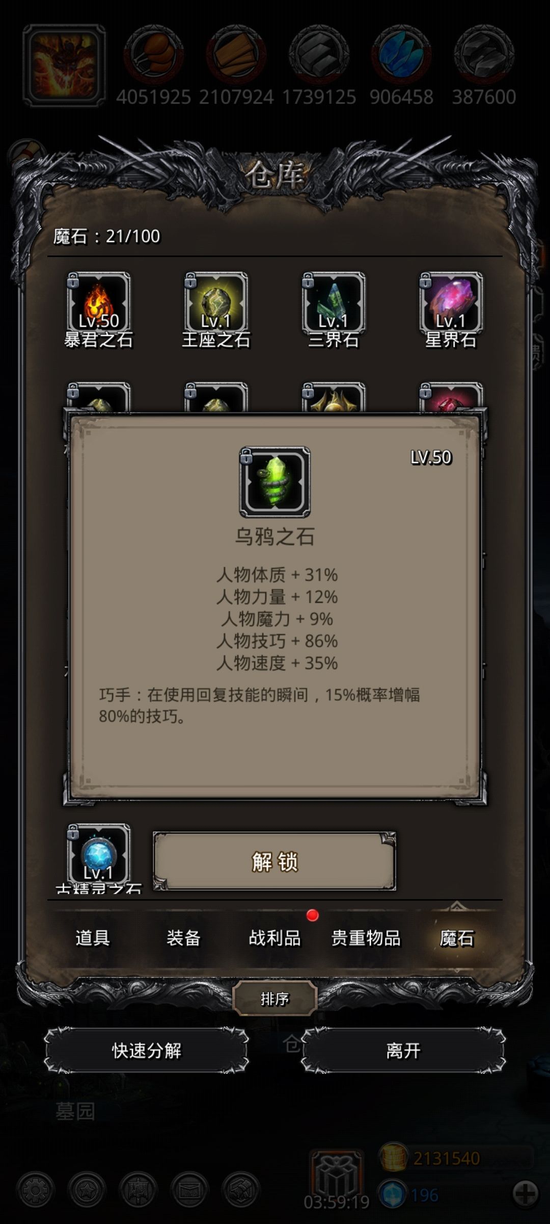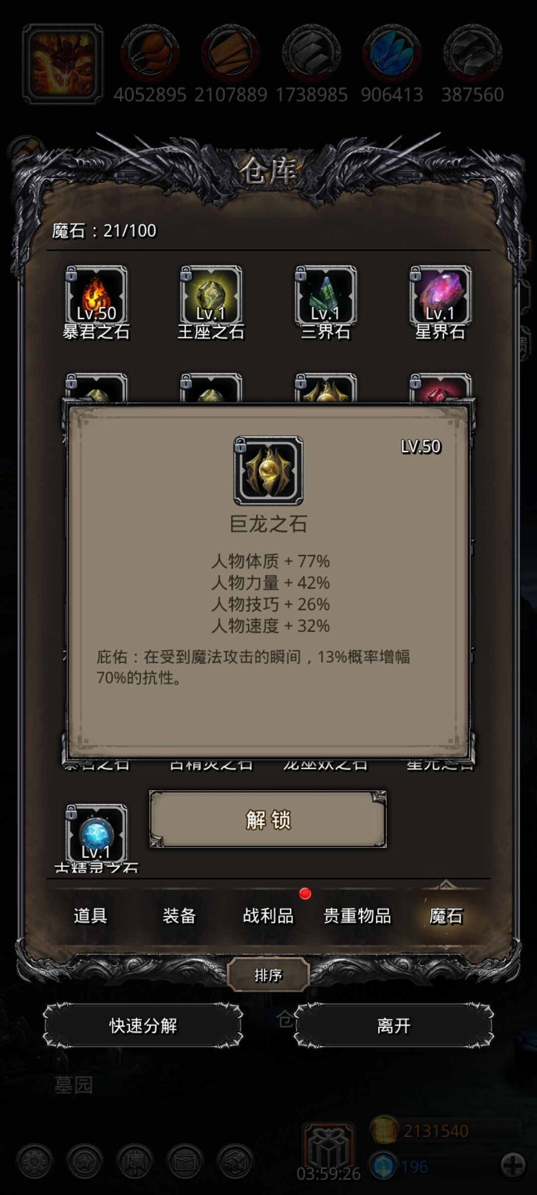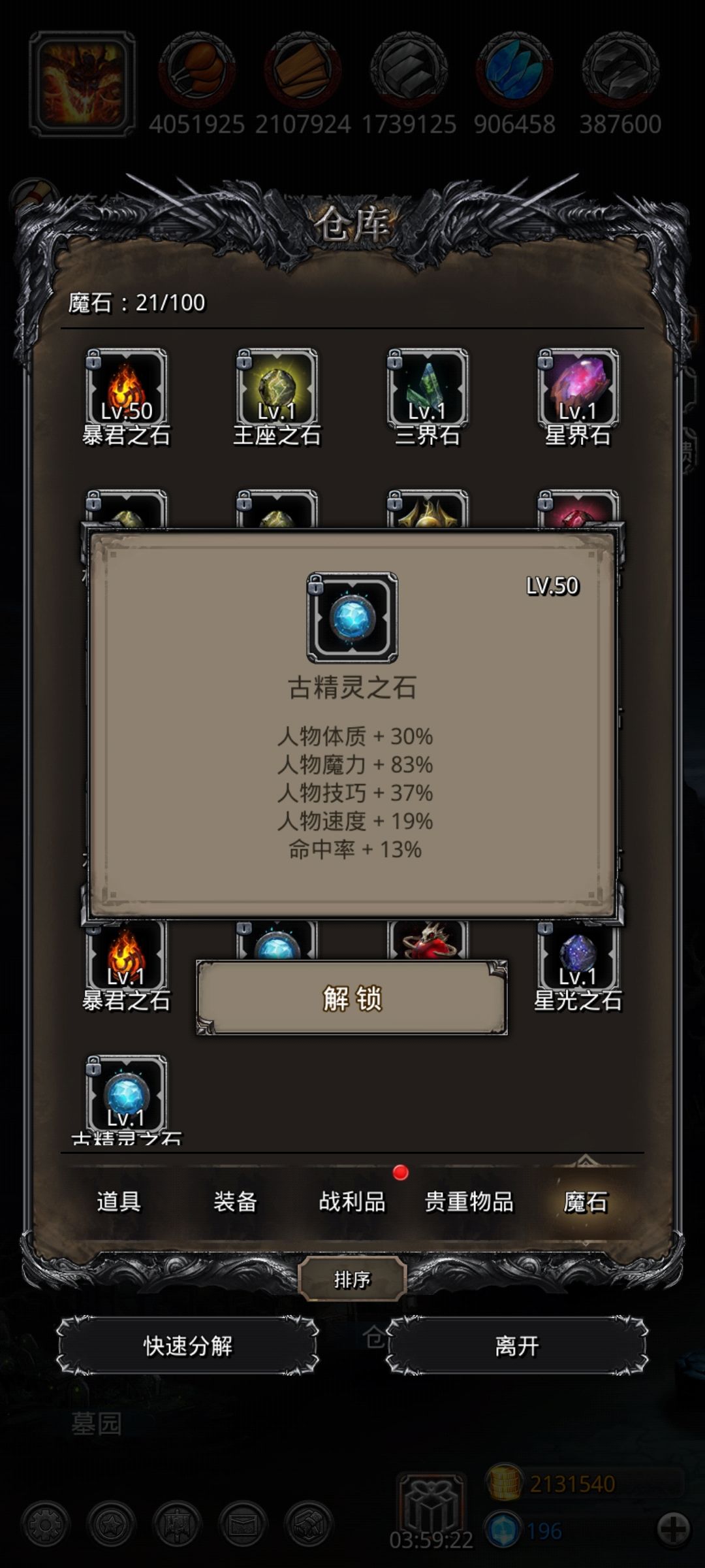 至于后期魔石开了以后,先升四个魔石凑分,冒险,然后就不用升了。自己用的基本上都是保底魔石,也毕业了。毕业了再赌石,嫖酒馆,